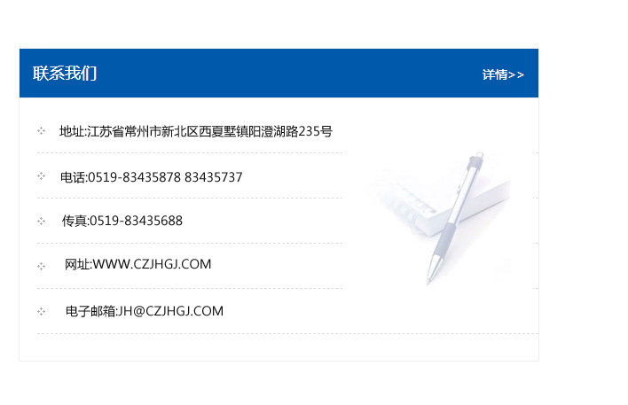 地址:常州市新北區友邦商務大廈1幢16、17層  電話:0519-85101652  傳真:0519-85112595  郵編:213022  網址:www.cz-jiayue_cn.jianzhognkeji.com  郵箱:xiajifengaa@163.com